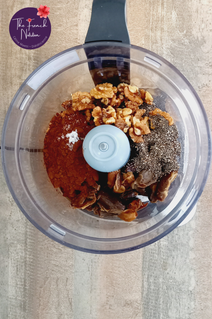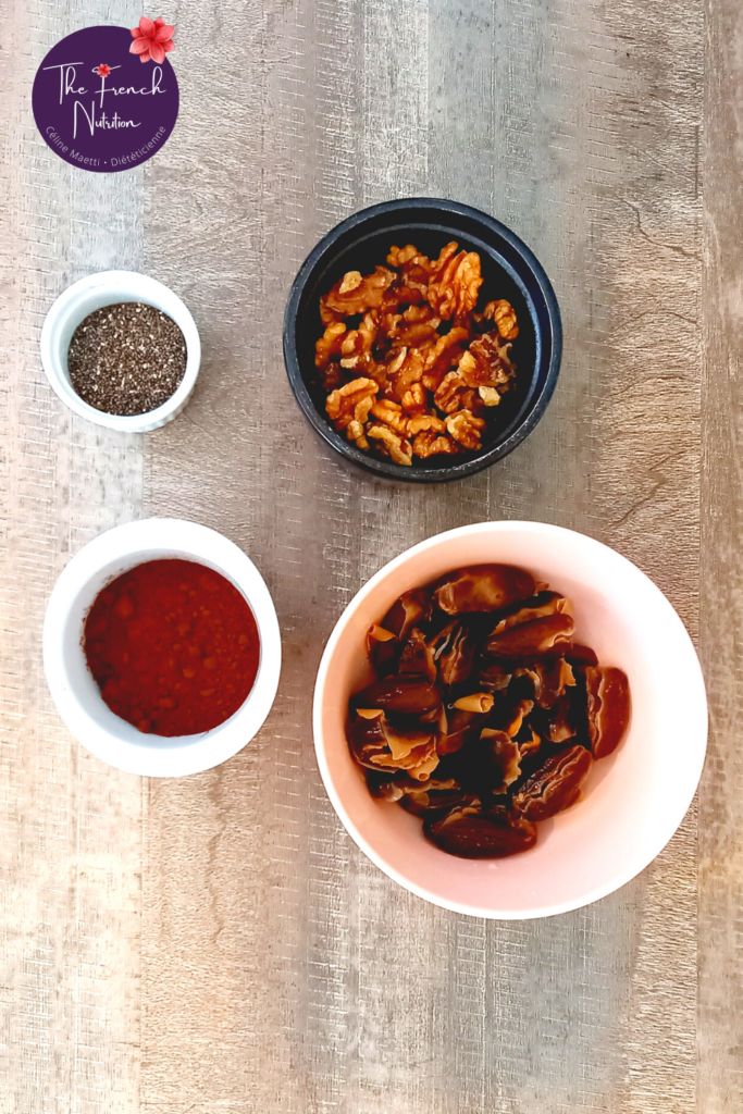 - Pour les dattes, préférez les dattes Medjool. Car ce sont de grosses dattes avec une texture presque caramélisée par rapport aux autres dattes. Elles sont collantes et molles généralement. Et, elles servent de liant et apportent le sucre dans cette recette. De plus, elles contiennent beaucoup de fibres ! Mais, vous pouvez utiliser d’autres dattes. Il faudra vérifier qu’elles soient dénoyautées et molles. Vous pouvez les ramollir un peu à l’eau chaude. De nombreuses personnes pensent que les dattes sont séchées alors que ce sont des fruits frais. Ce n’est qu’une fois le paquet ouvert que les dattes commencent à se dessécher et à devenir plus dur.