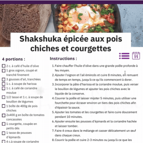 • Répartition des macros donnée pour chaque recette, y compris les calories, les protéines, les glucides, et les graisses.