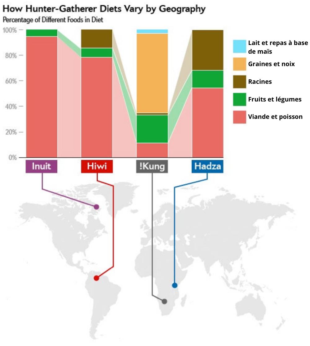 Examinons de plus près comment la localisation géographie influence les aliments que différentes personnes mangent. En moyenne, l’alimentation des chasseurs-cueilleurs modernes est composée d’environ 65% de végétaux et de 35% de viande.